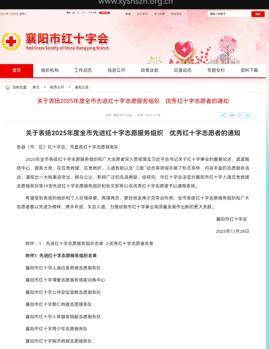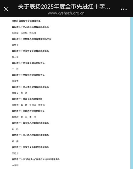 校红十字会(襄阳市红十字青少年志愿服务队)积极参加2025年度各项红十字志愿服务活动,表现突出,被襄阳市红十字会授予“2025年度先进红十字志愿服务组织”称号。这是我校红十字会连续第六次获此殊荣。医学院教师韩钰、李国海,护理2406班张悠均、护理2403班汪紫涵四人被襄阳市红十字会评为“2024年度优秀红十字志愿者”。