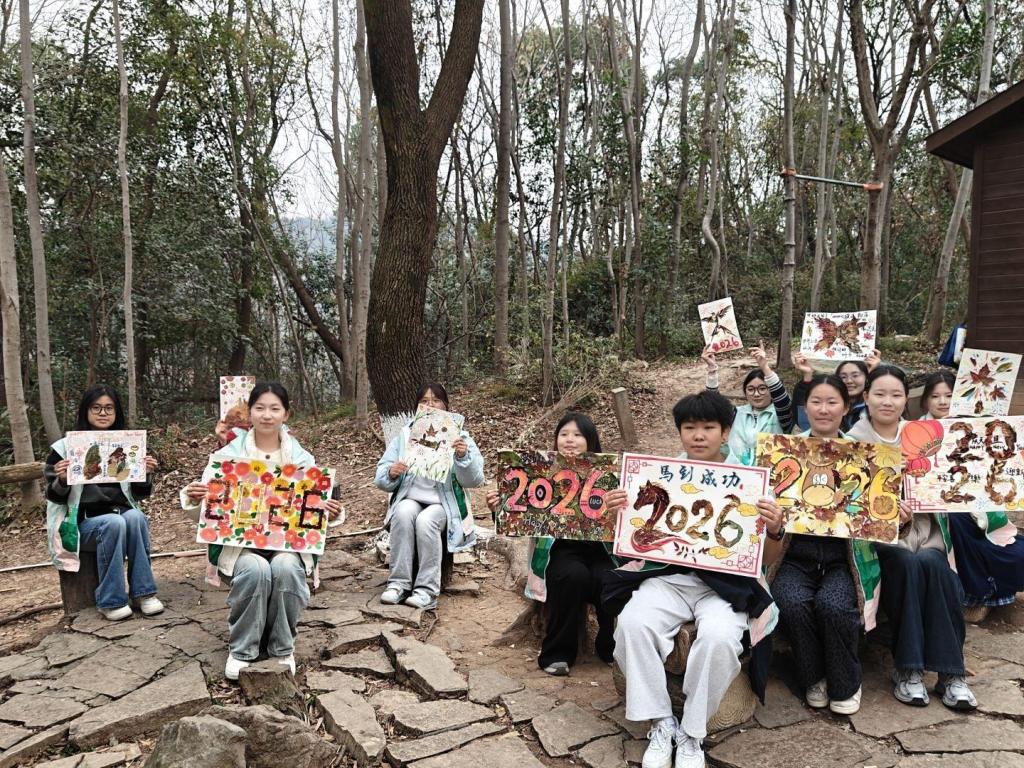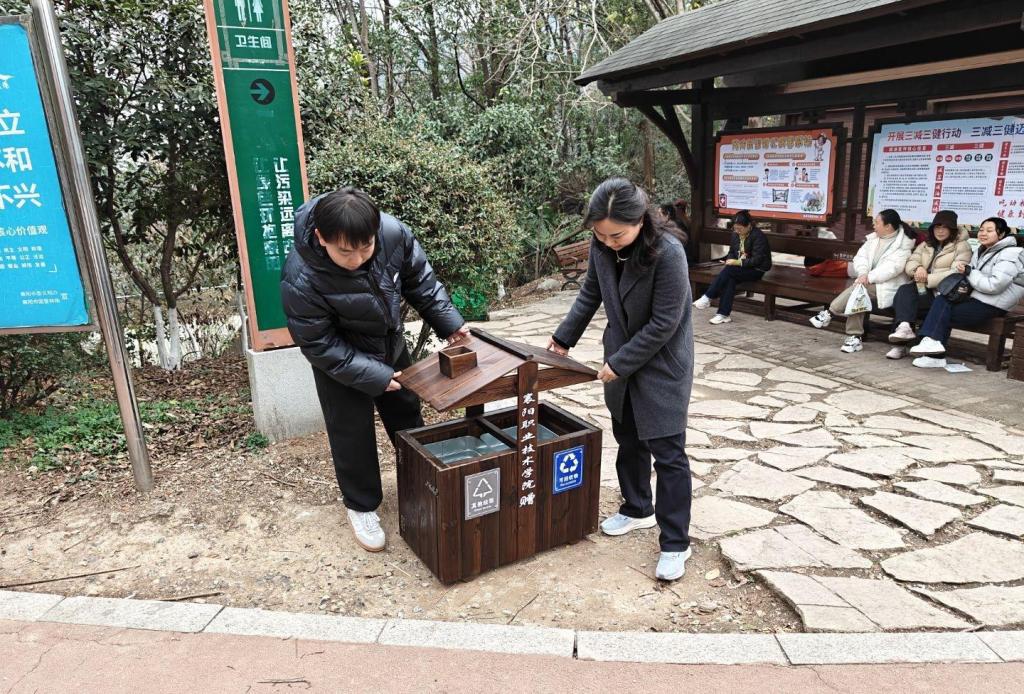 沿着山路,师生们化身生态卫士,手持清洁工具,沿途细致捡拾垃圾,清洁山道,并向登山游客发放环保帆布包,耐心宣讲生态环保理念,巧妙结合医学知识倡导健康生活方式。活动还特别设置了垃圾桶捐赠与安置环节,为景区环保基础设施添砖加瓦。在“自然共生”环保共创区,师生们利用落叶创作“庆元旦”树叶画,用创意表达对岘山生态的美好祝愿。
